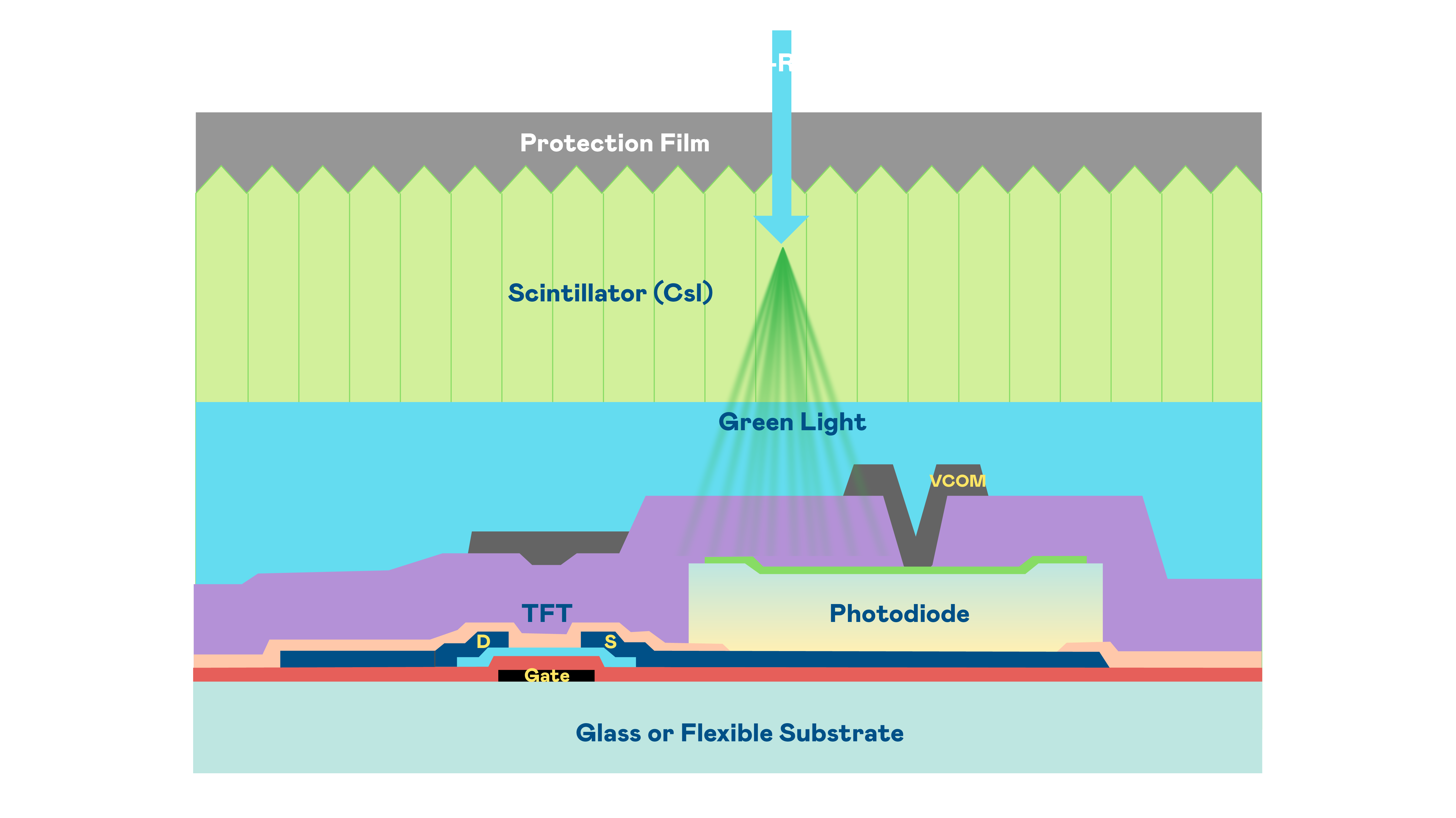 z6.com的X光影像感測陣列使用薄膜電晶體 (TFT) 作為每個像素的讀取開關,搭配光電二極體(Photodiode)的光電轉換元件,用以感測X光影像訊號。
